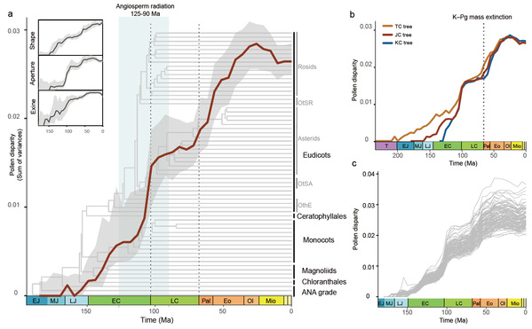 图3. 随时间变化的被子植物花粉形态多样性(disparity through time, DTT):a)基于nmds排序;b)基于被子植物冠群不同起源时间假说;3)基于100次随机子采样(n=1000)
