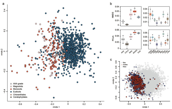 图2. 被子植物花粉的形态空间展示:a)基于nmds排序的现存花粉形态空间分布;b)被子植物主要类群的形态多样性比较;3)理论花粉形态空间