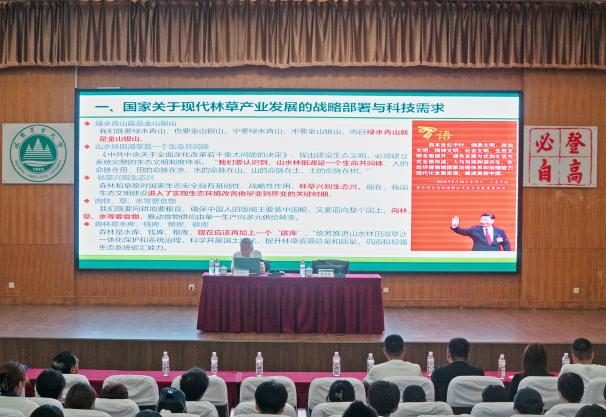 报告会上,尹院士以“现代林业科学问题与人才成长”为题,从“学林爱林”的行业情怀切入,深入剖析了当前林业科学面临的挑战和机遇,强调林学青年要坚定理想信念,努力成为适应现代林业发展的高素质人才。随后,他系统阐述了我国现代林草产业发展的战略部署与科技需求,提出要构建森林木材、碳汇及生态产品的多元经营体系,并详细讲解了碳汇及生态产品生产力提升的理论与技术路径。结合五十载科研经历,尹院士将“知林、爱林、兴林”理念贯穿全程。他勉励本科生将个人发展融入“双碳”目标与乡村振兴战略,在解决粮食安全与生态保护的时代课题中,树立“以科技护绿、以专业兴林”的崇高追求。