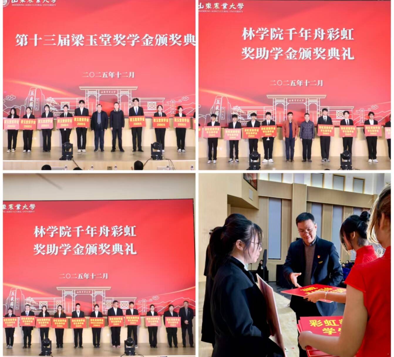 近日,林学院梁玉堂奖学金、千年舟彩虹奖助学金颁奖典礼在泮河校区东南报告厅隆重举行。千年舟集团工会主席、安全品质部高级总监傅毅,学院领导班子成员、全体辅导员、2025级全体新生参加活动。